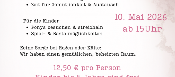 Am 10.05.26 ist Muttertag und wir laden euch an unsere Kaffeetafel ein. Verbringt einen entspannten Nachmittag bei uns mit Kaffee und Tee, einem bunten Kuchenbuffet und herzhaften Snacks. Endlich Zeit für Gemütlichkeit und Austausch untereinander. Die Kinder dürfen in der Zeit die Ponys besuchen und streicheln sowie die Spiel- und Bastelangebote nutzen. Jede Mama ist…