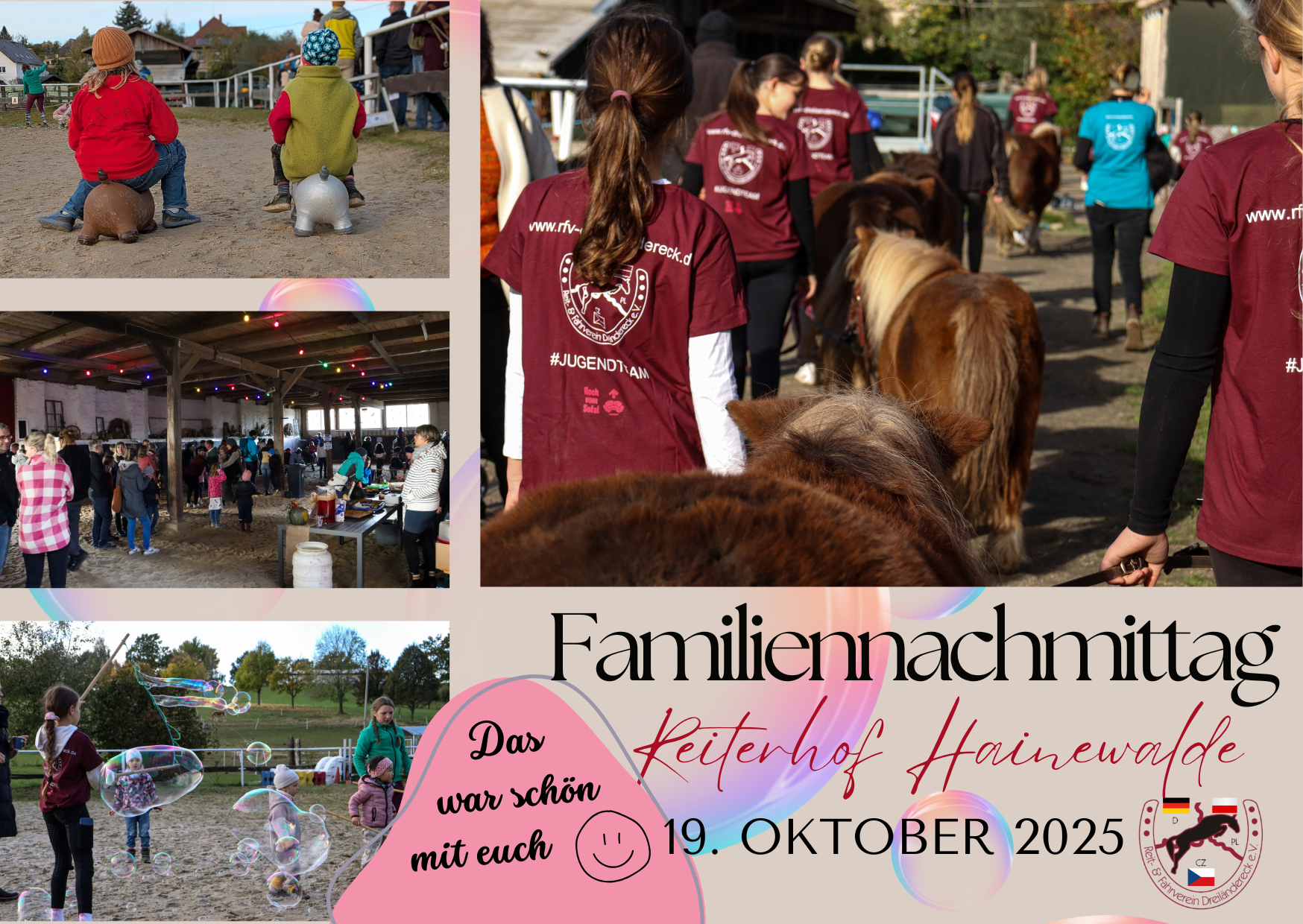 Am 19.10.2025 haben wir unser Familienfest auf dem Reiterhof Hainewalde gefeiert. Das Besondere dabei war: Das Festprogramm wurde fast komplett vom Jugendteam übernommen. Viele Wochen haben sich die jungen Leute mit Hilfe der Förderung „Hoch vom Sofa“ und unserer Jugendwartin Sophia auf die Stationen vorbereitet. Jeder durfte Ideen und seine Talente einbringen. So vielfältig, wie diese waren, spiegelte sich das dann auch im Programm wieder. Es gab eine rießige Auswahl Mitmachaktionen, z.B. Zöpfe flechten bei den Ponys, Schatzsuche mit echten Edelsteinen, Riesenseifenblasen, Pferdewellness, Slackline und Jonglage, Anhänger basteln, Entspannungslounge, Aerobic auf den Holzpferden und eine Fotowand (Impressionen dafür siehe unten). Für Kaffee und Kuchen sowie Leckerem vom Grill, Pommes und Getränke sorgte der Verein in bewährter Weise. Als Bonus gab es noch Live-Musik UND Sonne 🙂 …die hatten wir schon lange nicht mehr gesehen, aber für unser Event bestellt. Und geliefert bekommen!