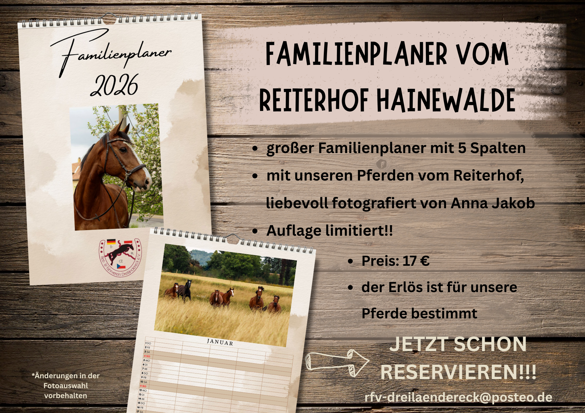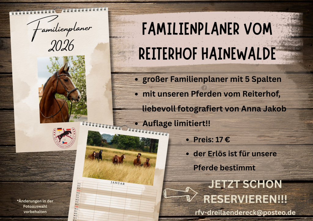 Dieses Jahr gibt es endlich wieder eine schöne Druckversion mit herrlichen Bildern unserer Pferde – professionell fotografiert von Anna. Es ist ein großer Familienplaner mit Platz auf 5 Spalten. Auflage ist limitiert – am besten gleich reservieren.