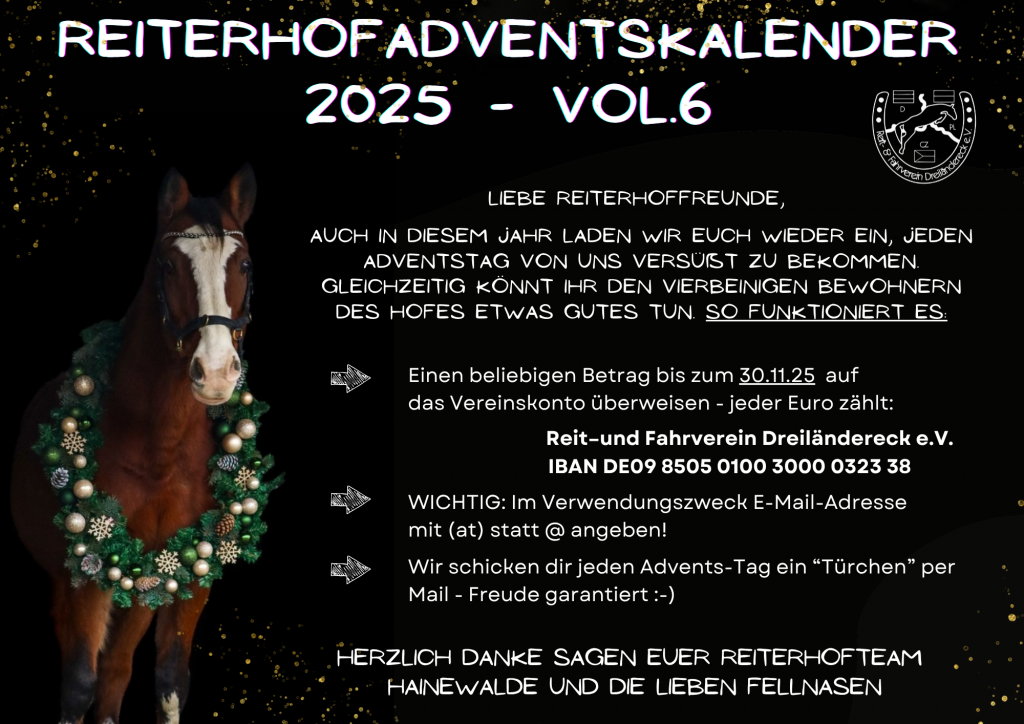 Außerdem gibt es wieder den beliebten Reiterhof-Adventskalender. Funktioniert ganz einfach und erfreut dich 24 Mal – jeden Tag im Advent eine kleine Freude mit Fotos und Botschaften für Herz und Seele. Du entscheidest, wieviel du dafür geben kannst und möchtest, überweist den Betrag auf unser Vereinskonto und schreibst im Betreff deine E-Mail-Adresse (mit at statt @, sonst geht es nicht). Ab 01.12.25 bekommst du jeden Morgen ein „Reiterhof-Adventskalender-Türchen“ in deinen E-Mail-Postkasten geschickt und kannst dich den ganzen Tag darüber freuen. Probier es einfach aus!