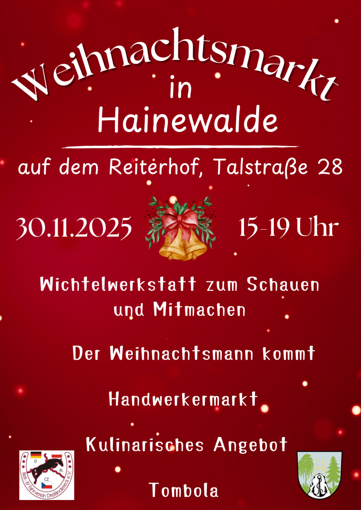 Am 30.11.2025 zum ersten Adventssonntag findet von 15-19 Uhr der Hainewalder Weihnachtsmarkt bei uns auf dem Reiterhof statt. Bei wunderschönen weihnachtlichen Ambiente gibt es leckere süße und herzhafte Speisen, Getränke sowie ein buntes Programm für die ganze Familie. Es darf gebastelt und geschaut, gekauft und probiert werden. Neben einem Handwerkermarkt wird in der Wichtelwerkstatt wieder fleißig kreativ gewerkelt. Märchenoma Anna liest aus ihrem dicken Buch vor, weihnachtliche Musik erklingt, funkelnde Weihnachtskugeln dürfen mit Wünschen versehen an unserem großen Weihnachtsbaum aufgehängt werden und natürlich kommt der Weihnachtsmann. Seid willkommen zu unserem 2. Hainewalder Weihnachtsmarkt auf dem Reiterhof.